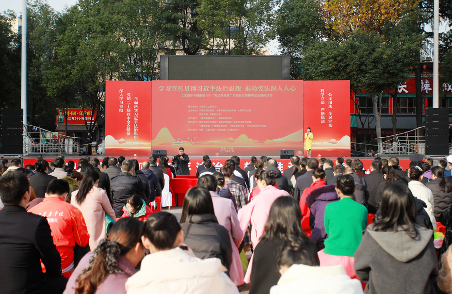 12月1日上午,十堰市“宪法宣传周”启动仪式暨集中法治宣传活动在十堰市人民广场隆重举行。活动设置了“我与宪法合个影”打卡区、“八五”普法成果展示区、“法治文化”体验区、“法律互动”游戏区、“法律门诊”咨询区,内容丰富、形式多样的宣传形式迅速成为法治能量的“汇聚地”和市民群众的“打卡点”。80家参会单位摆开宣传长龙,通过展板展示、资料发放、案例讲解等方式,向群众普及与工作生活息息相关的法律知识,发放宪法读本、宣传折页、法治环保袋、围裙、知识手册等各类普法宣传品1.5万余份,现场赠送宪法宣传明信片500张和法治春联100余副,现场接待咨询群众1000余人次。