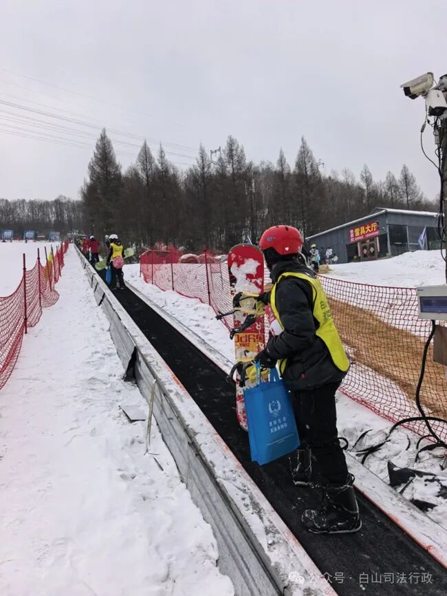 雪场普法行,守护冰雪情。在白山市飞宇滑雪场,结合冰雪旅游场景开展精准普法,普法工作者在滑雪场入口、滑雪等待区等游客聚集区域向滑雪爱好者及教练发放普法书籍和普法宣传用品,并围绕滑雪运动中常见的法律问题进行现场普法,让游客在享受冰雪乐趣的同时,增强风险防范意识和依法维权能力。