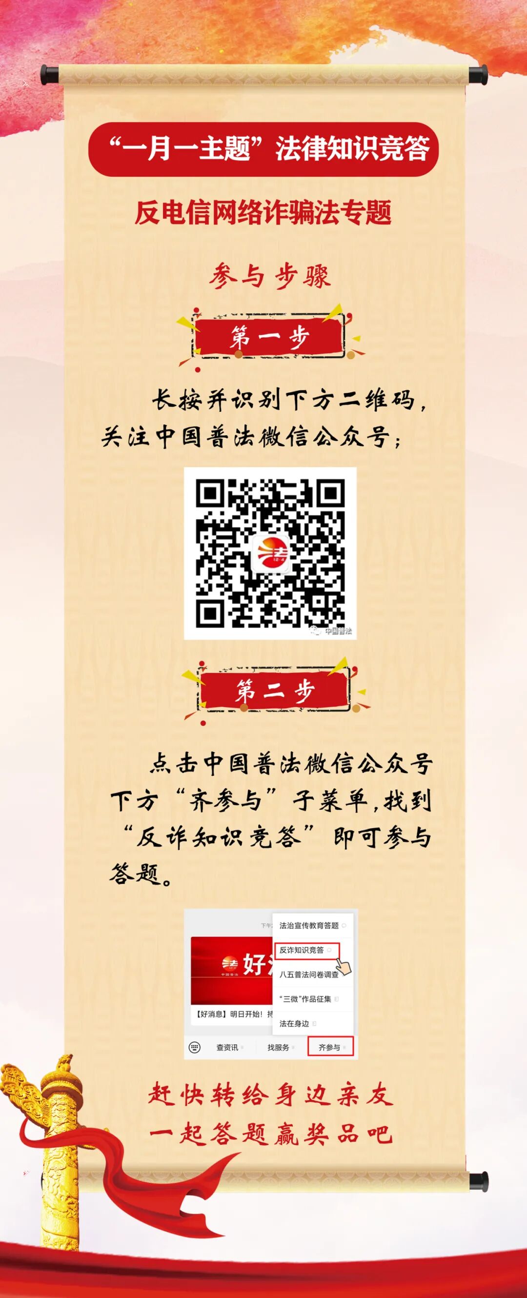 中国普法微信公众号于2025年11月11日至30日组织开展“一月一主题”法律知识竞答・反电信网络诈骗法专题活动。
