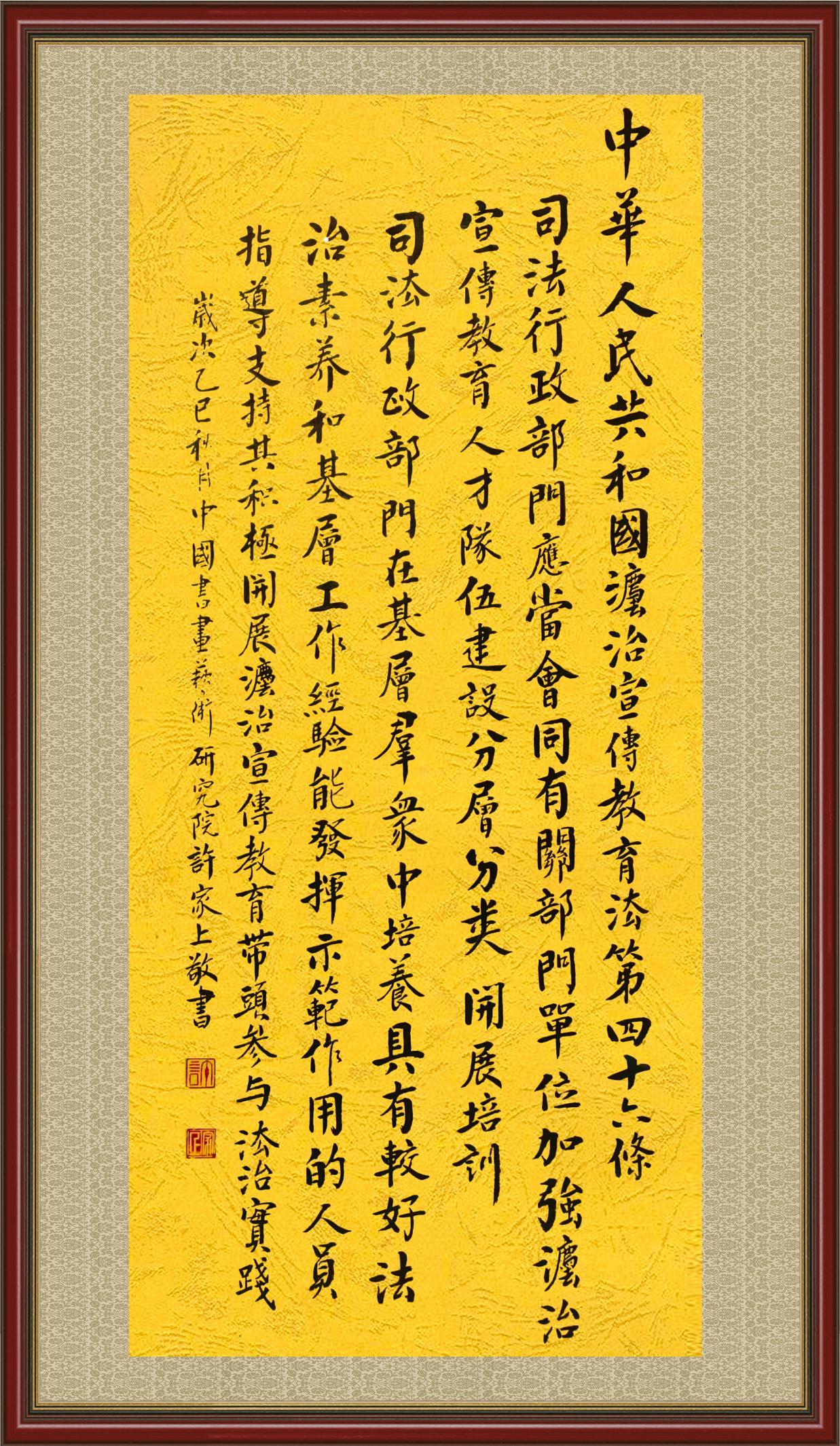 2020年7月11日,由法治日报社主办的“书·法”系列活动正式启动,先后书写《中华人民共和国民法典》《中华人民共和国宪法》《中华人民共和国民营经济促进法》等21部法律法规。