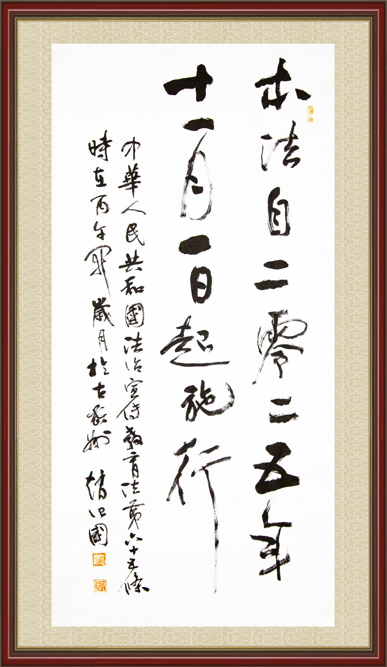 2020年7月11日,由法治日报社主办的“书·法”系列活动正式启动,先后书写《中华人民共和国民法典》《中华人民共和国宪法》《中华人民共和国民营经济促进法》等21部法律法规。